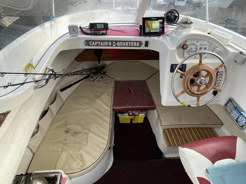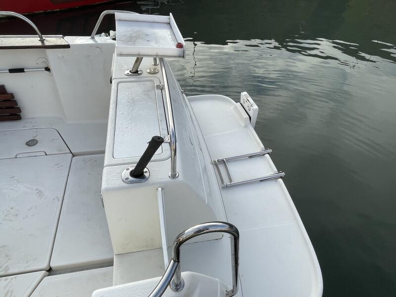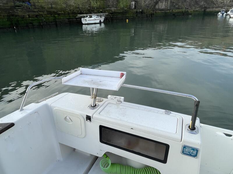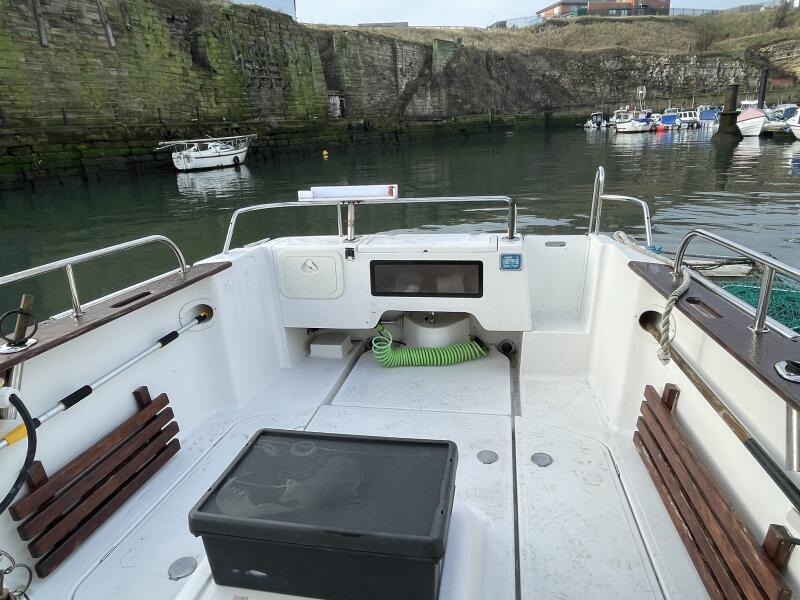 GRP Constructed day angler with white hi-gloss topsides and smart burgundy decals. Semi displacement hull with directional skeg and stainless steel rudder. Large capacity anchor locker with anchor and 6M chain + 50M warp. Moulded bathing platform with stainless steel ladder. Large self bailing deck with watertight locker storage port and starboard of engine hatch. Live bait well at transom with electric pump. Teak topped gunwales with built in net rollers port and starboard.