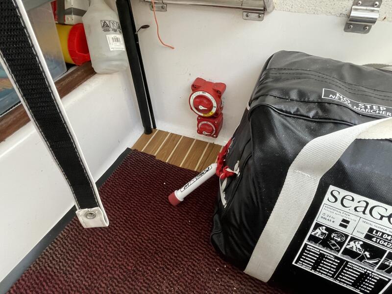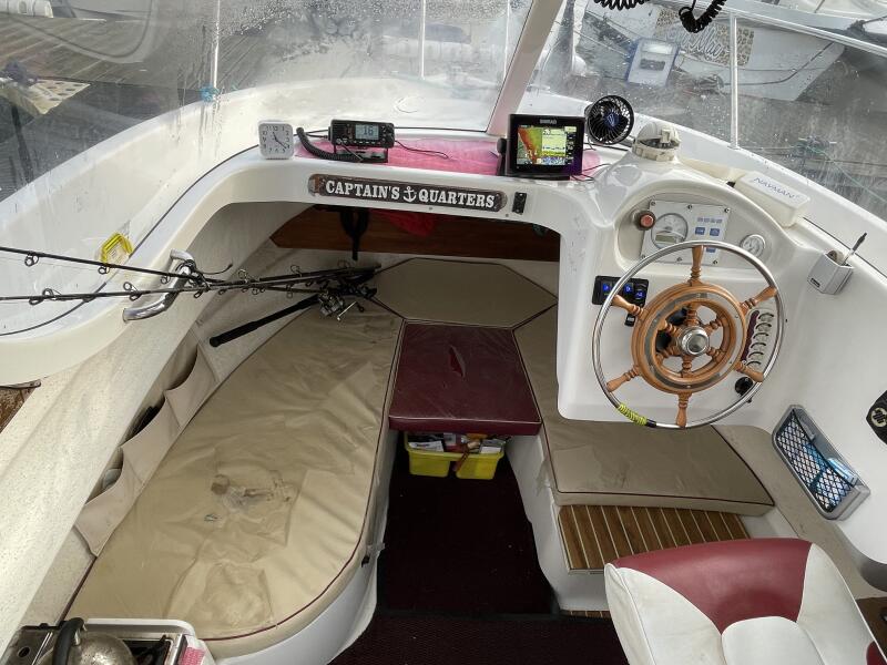 The wheelhouse is entered via a lockable sliding door. Step down into the cabin with it 6 foot plus headroom and excellent visibility. To starboard is the pilot seat. This can drop down if you prefer to stand when helming. To port is a small galley area with a single burner hob. Two single berths (still in the wrappers) allows you to get your head down should you wish to overnight. Opening roof hatch and ports for ventilation. 12V deck head lighting.