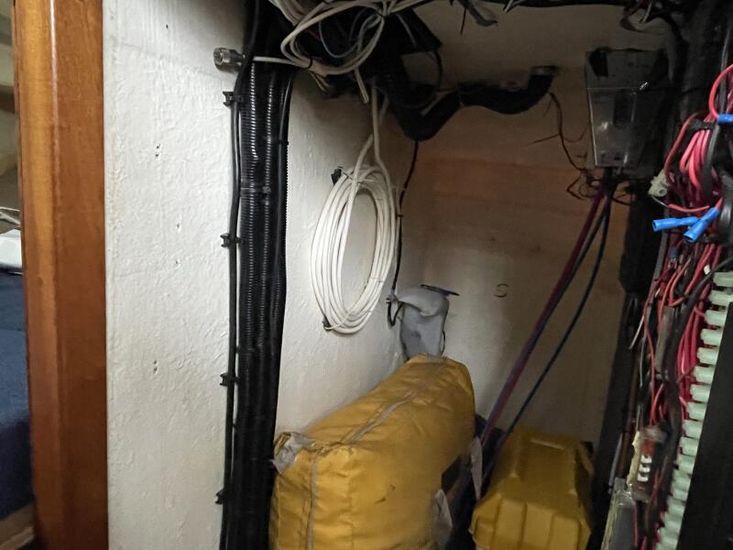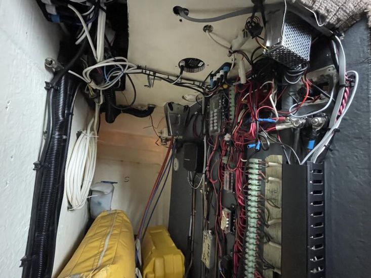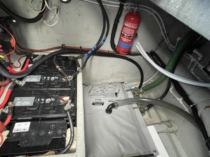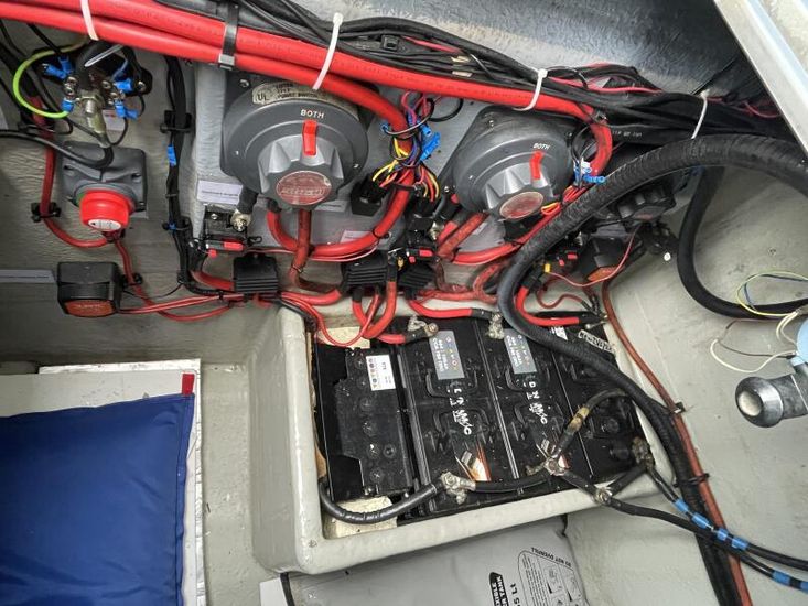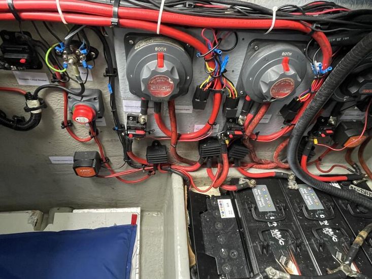 Bank of 5x12V batteries providing engine start, domestic and windlass power. There are 4 batteries located in a separate watertight compartment forward of the engines and the final battery in a comapartment in the bow. Similar to the engines, access is excellent should they need changing or if new wiring needs installed. Everything is so accessible on this boat.Â