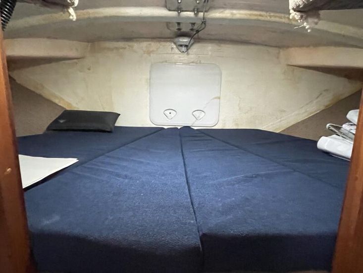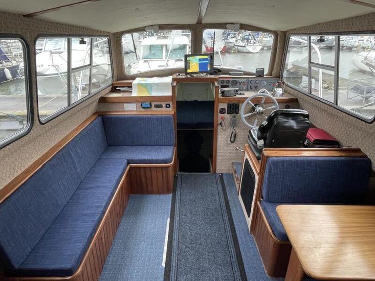 Helm position on starboard side forward of dinette. Padded helm seat. Wheel steering and full engine instrumentation. Chart area to port. Bow with 2-berth cabin.Â