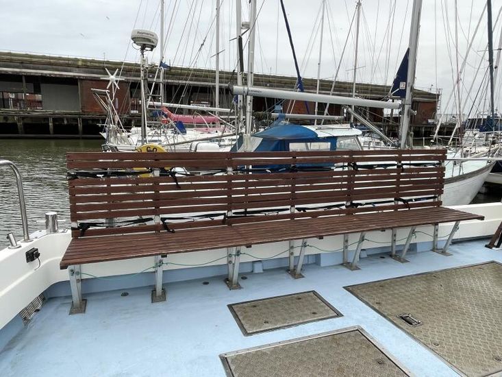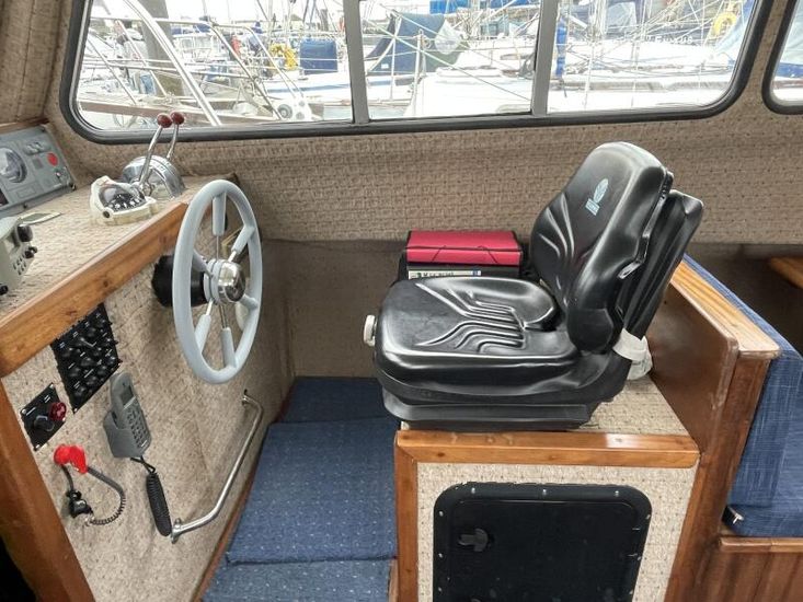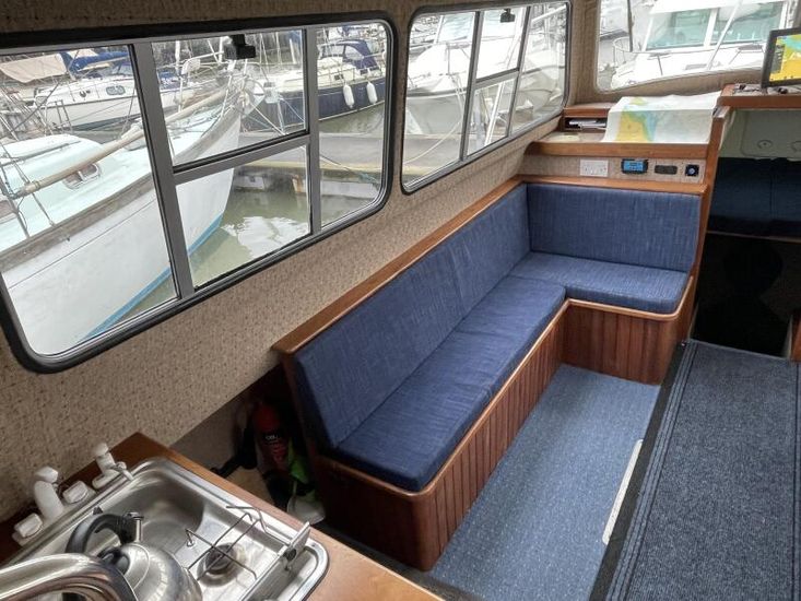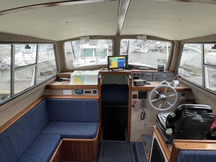 Huge wheelhouse with L-shaped bench seating to port and a vis-Ã -vis seating dining area to starboard. Floor and walls are fully lined and insulated. Huge windscreen and side windows allow lots of natural light and increase driver visibility.Â