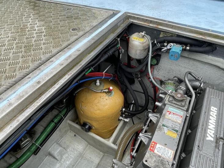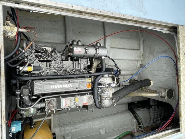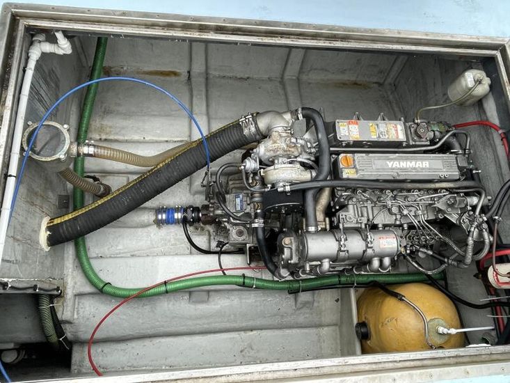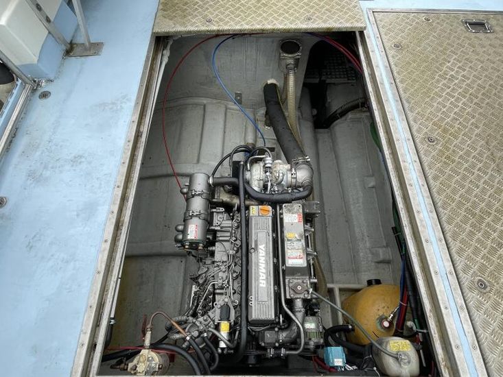 Vessel powered by twin Yanmar 4LHA-STP inboard diesel engines. These 4-cylinder diesel workhorses are fresh water cooled and are rated at 240hp each. Engine start panels mounted in wheelhouse with analogue hour meters, rev counters and gauges for oil pressure and temperature. Engines have completed 932 hours each. Â Vessel cruises happily at 18-20 knots depending on number of people carried, cleanliness of the hull and sea conditions. This will provide a range of around 450 Kilometres.Â
