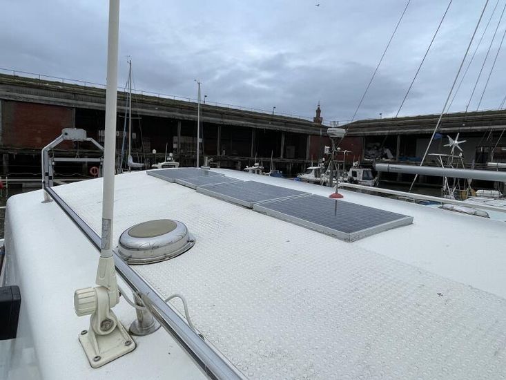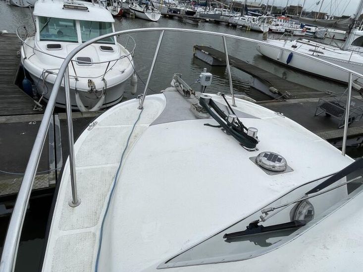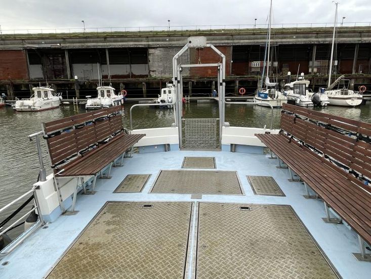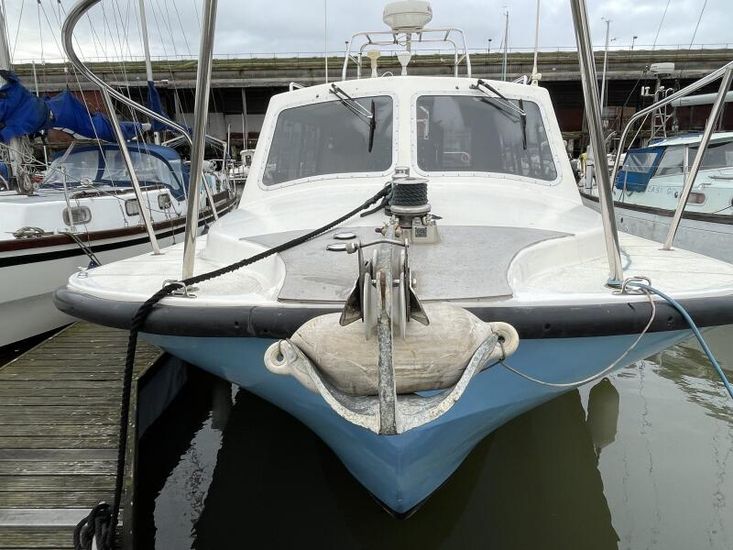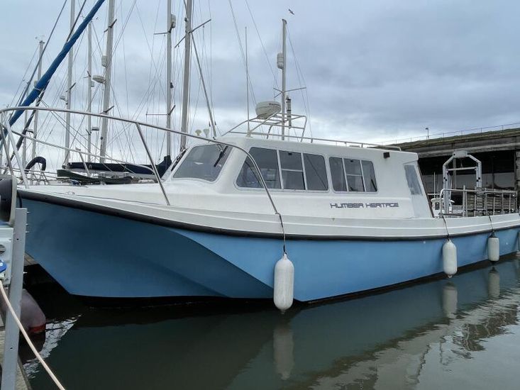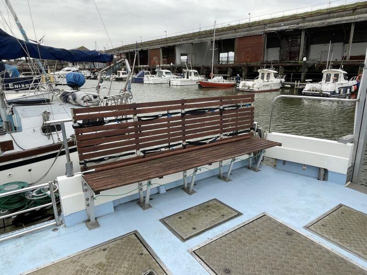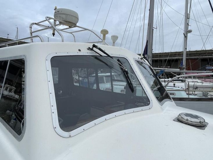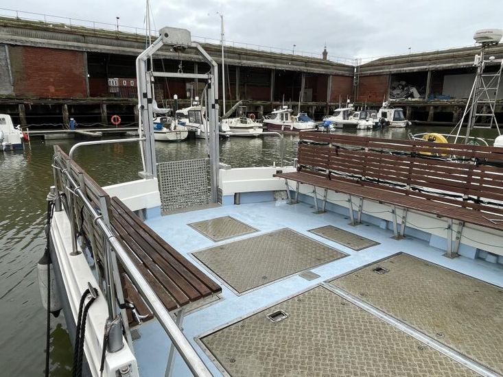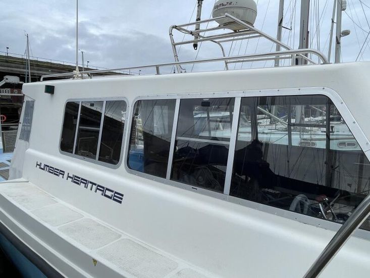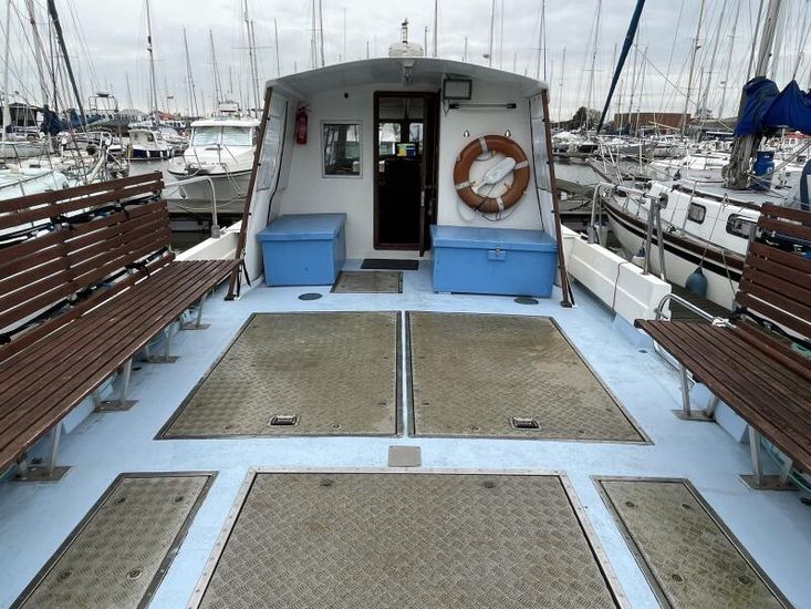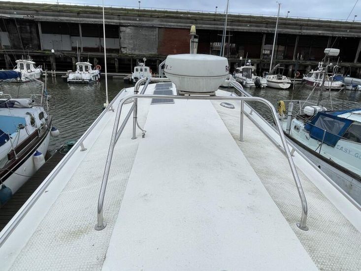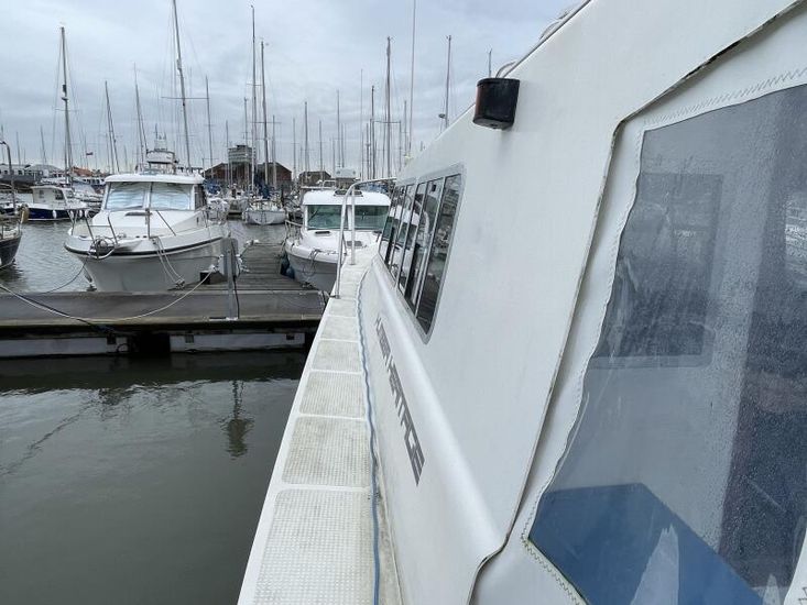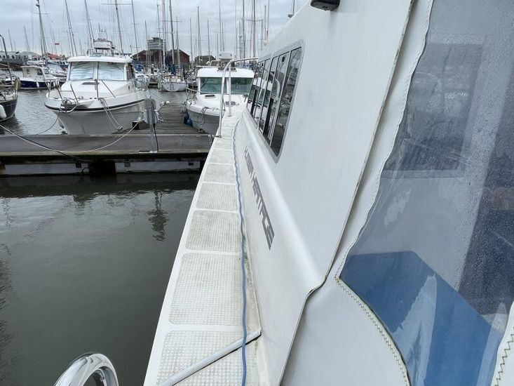 GRP constructed motor vessel built by Offshore Boats of Wadebridge Cornwall. 12 meters of heavily built craftsmanship with modified deep-V hull and flared bow minimising sea spray. Huge flush decks allowing easy and unencumbered access. Stainless steel guardrails surround the cockpit keeping guests and crew secure. Further stainless-steel protection at bow with handrails on roof for negotiating the side decks safely.Â