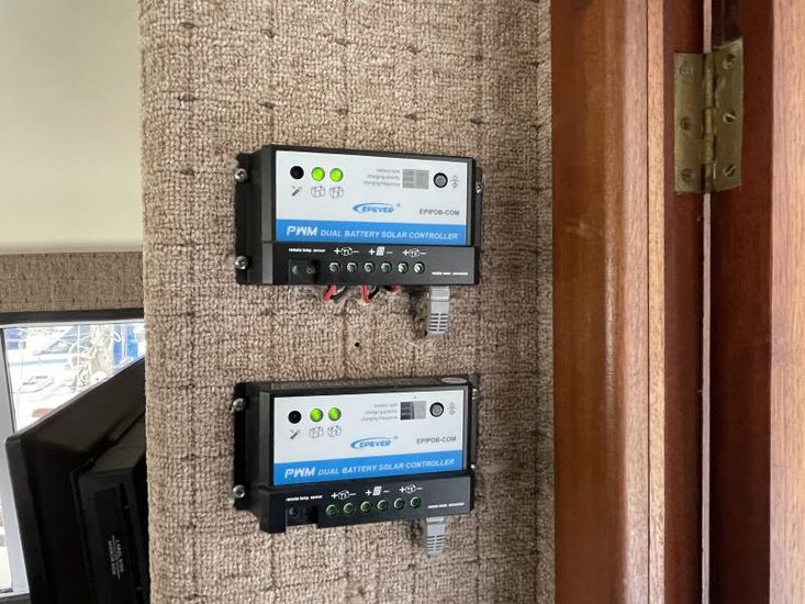 Batteries are fitted with isolators and are recharged in the following ways. From the engine alternators, trickle charged via solar panels mounted on wheelhouse roof or by the onboard smart charger.Â