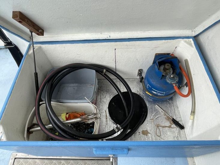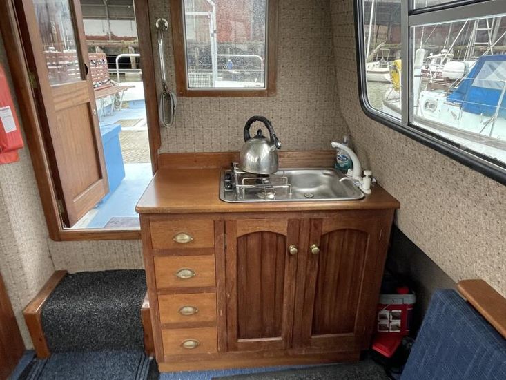 On the aft bulkhead is a galley with gas fuelled 2-burner hob and sink unit. Hot and cold pressurised water.Â